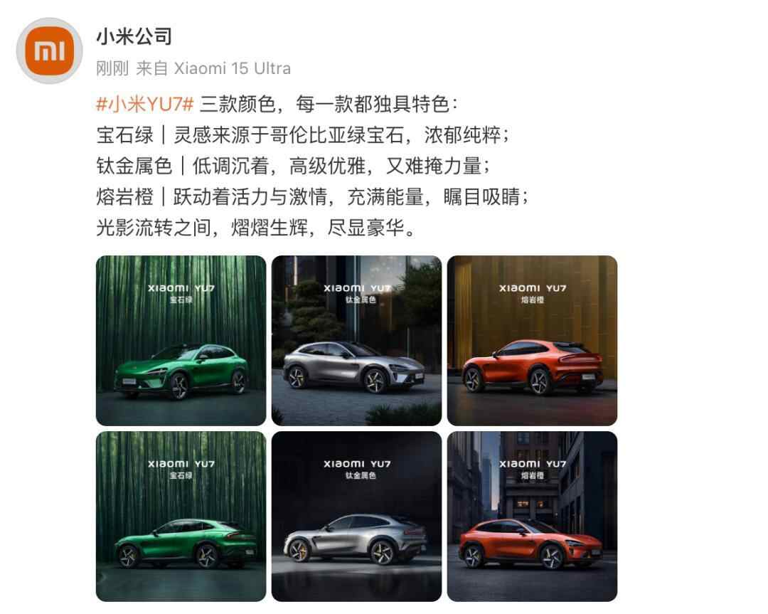 发布会上,雷军介绍了小米YU7的四款配色——宝石绿、钛金属、寒武岩灰、熔岩橙,还有5款将在之后的发布会上介绍。
