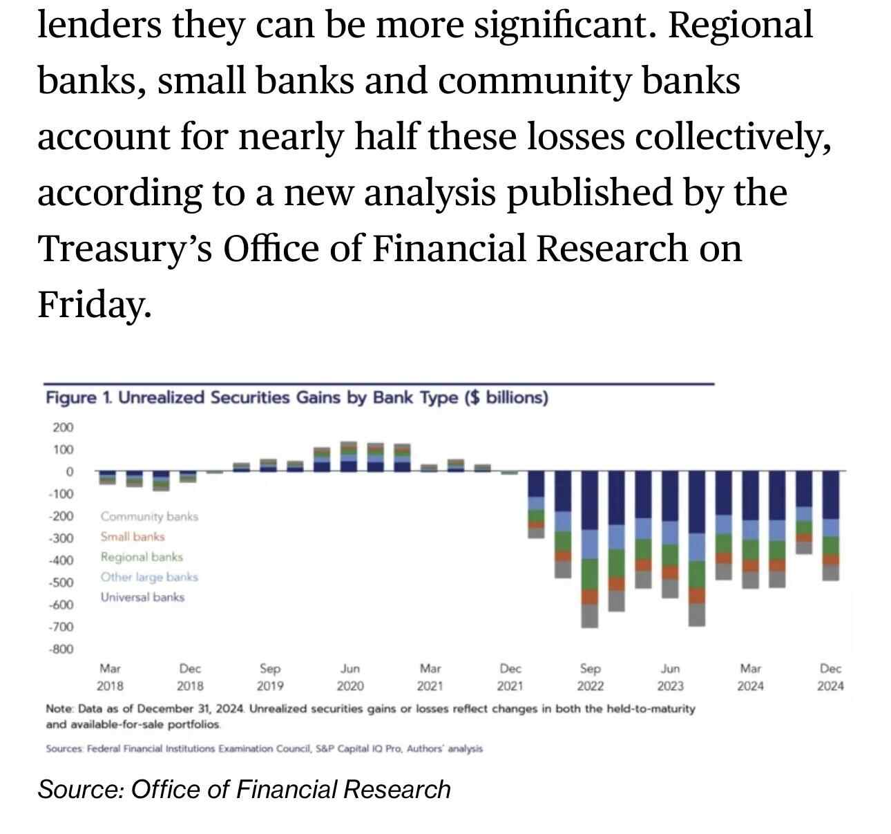 文章回忆道,2022年和2023年,美国国债和抵押贷款债券的“未实现损失”成为贷款机构的一大担忧,当时利率大幅上升,引发了以硅谷银行为首的几家银行倒闭。“未实现损失”,是指在某个资产或证券的市场价值低于其购入价格的情况下,尚未出售或平仓的投资组合中的损失。