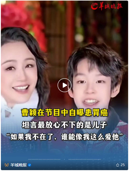 5月22日,据媒体报道,知名主持人曹颖曾在节目中自曝患胃癌,坦言最放心不下儿子,她表示:“我是真的后悔,儿子还小,你给事业做得再好,你不如多陪他长大。如果我不在了,谁能像我这么爱他。”