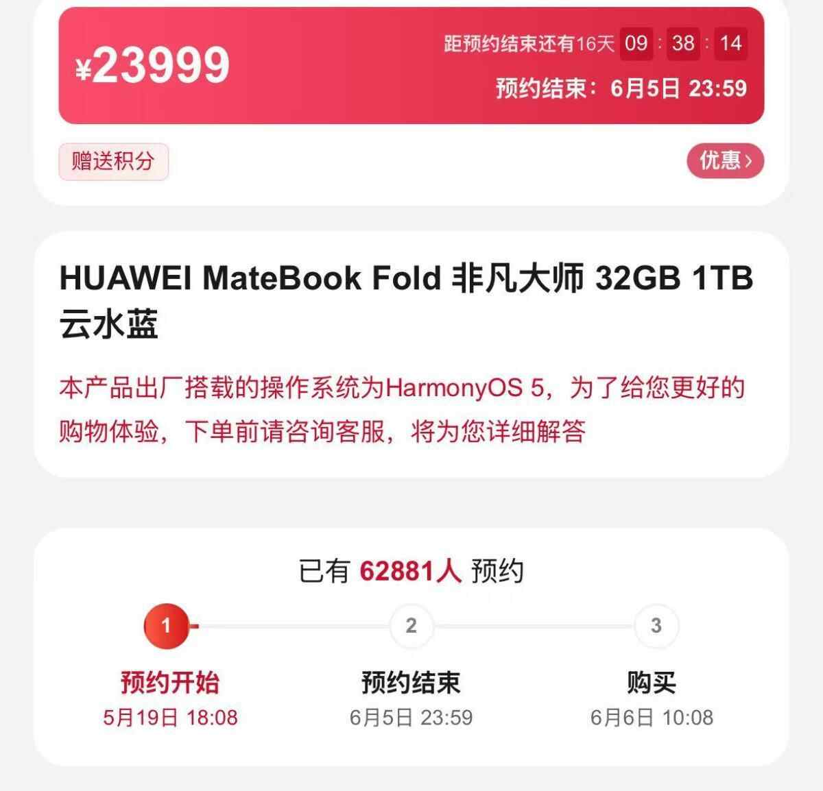 5月19日晚18点08分,MateBook Fold和MateBook Pro同时开启预售,截至5月20日下午两点,预售开启20个小时后,华为商城中MateBook Fold的预约人数已经超过6.2万人;而在华为京东自营旗舰店,预约人数也已经超过5.2万人。