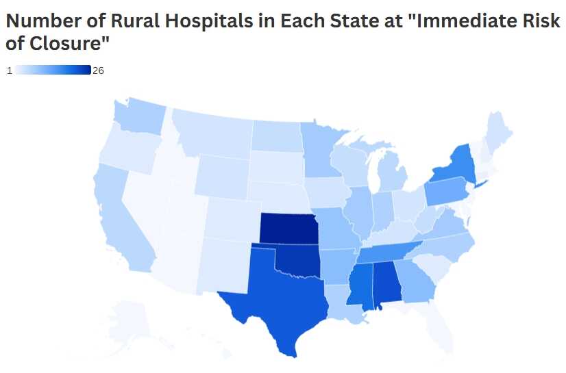 然而,美国医疗质量与支付改革中心(Center for Healthcare Quality and Payment Reform)指出,由于持续的财务亏损和低现金储备,全美近三分之一的农村医院已面临倒闭危险,这意味着医疗补助计划的削减可能会导致这些医疗机构关门。关闭医院数量最多的州包括堪萨斯州、俄克拉荷马州和亚拉巴马州。此外,俄克拉荷马州和纽约州几乎每三家农村医院中就有一家可能关闭,宾夕法尼亚州和弗吉尼亚州则约为每四家就有一家。