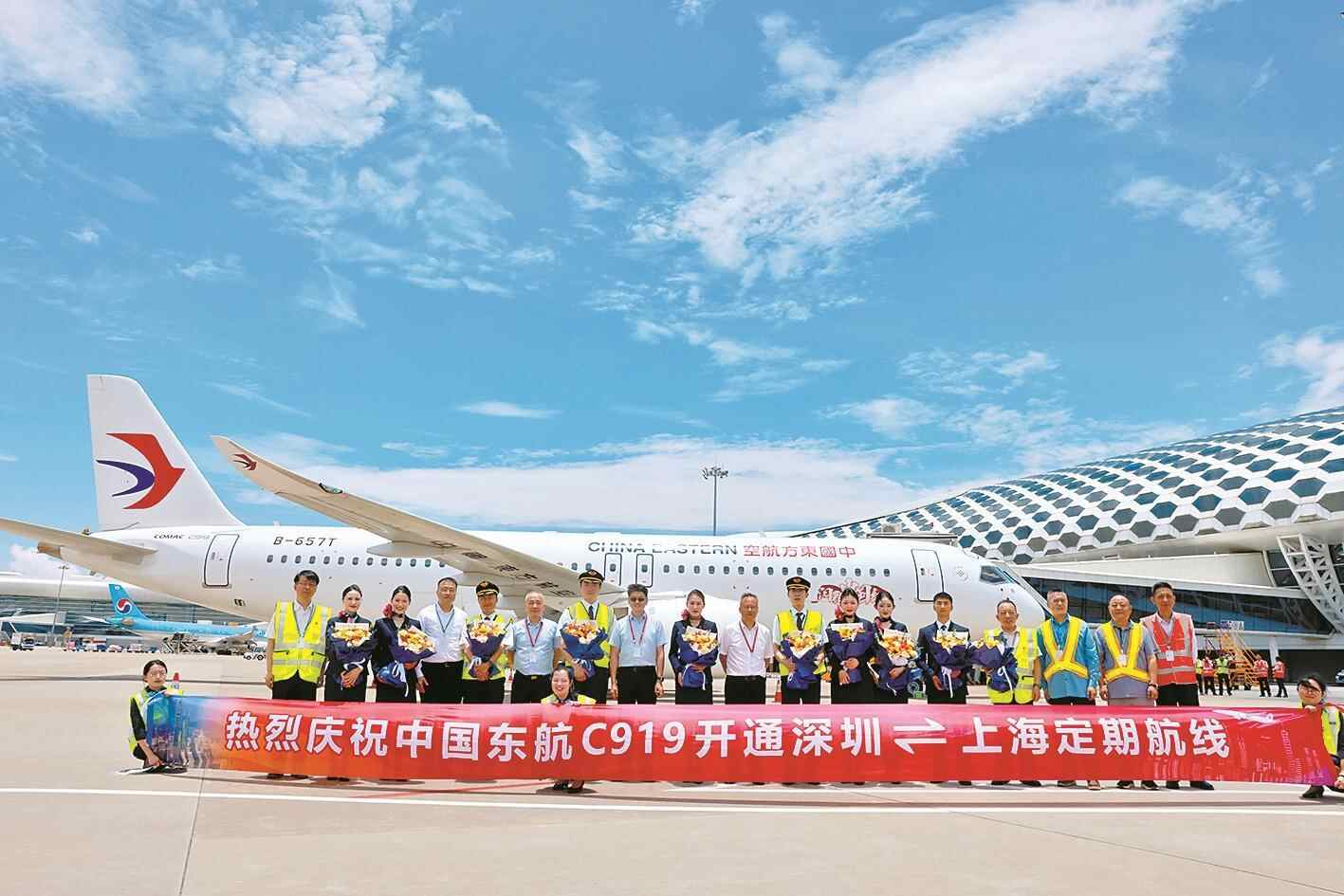 5月18日,东航C919客机再添一条定期商业航线。当天上午,机号为B-657T的国产大飞机C919执行MU5331航班,上午9时28分从上海虹桥国际机场起飞,历经近2小时飞行,于11时31分顺利抵达深圳宝安国际机场。这标志着国产大飞机C919正式投入上海虹桥—深圳直达往返航线运营,成为东航C919客机开通的第13条定期商业航线。当日,往返首航航班接近满座。
