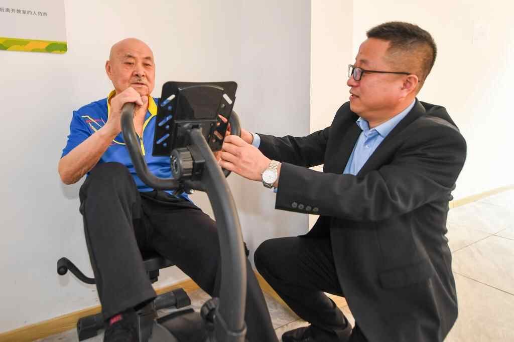 4月24日,在四平市地直街道社区居家养老服务中心,社区助老员王占野(右)指导一名老人使用健身器材。新华社记者 张楠 摄