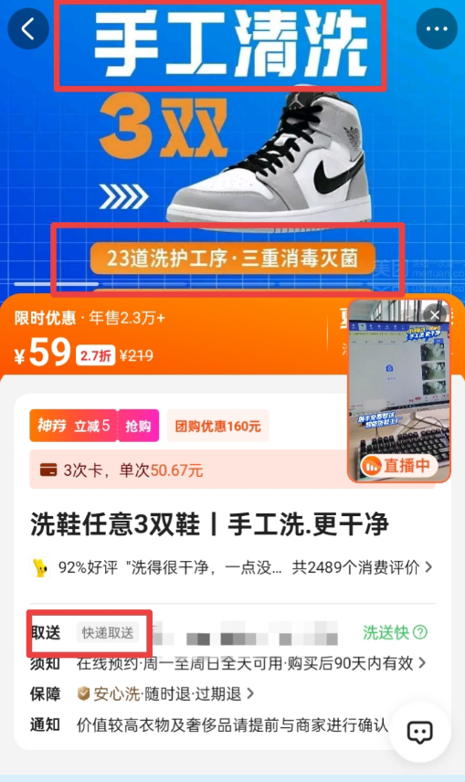 记者登陆某网购平台,找到了“某某鲸洗”。商家页面显示“正在直播”。画面中,多位员工穿着规范、动作娴熟,正在对鞋子进行手工喷洒泡沫、刷洗。员工还不断把洗好的鞋子进行打包,一个个写有“某某鲸洗”的打包箱堆积如山。