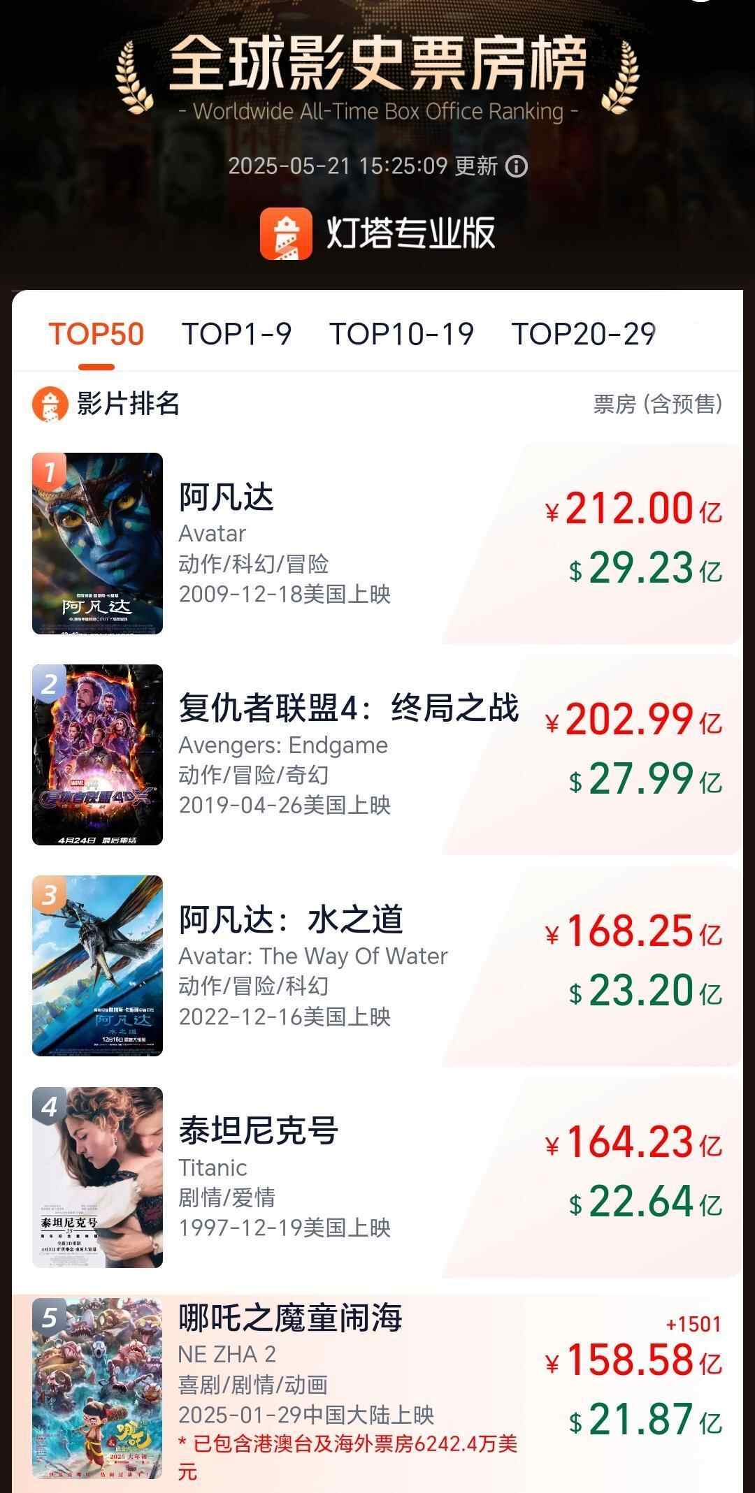据灯塔专业版,《哪吒2》目前全球票房超158.58亿元,全球排名第五。