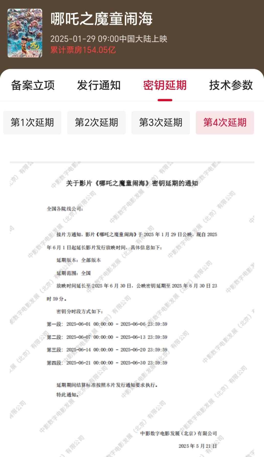 5月21日,据片方消息,电影《哪吒之魔童闹海》(哪吒2)密钥延期,将延长上映至6月30日,小朋友们可以在儿童节走进影院,观看这部国产动画。