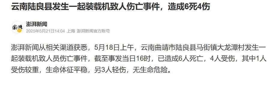 据澎湃新闻报道,5月18日上午,云南曲靖市陆良县马街镇大龙潭村发生一起装载机致人员伤亡事件,截至事发当日16时,已造成6人死亡,4人受伤,其中1人受伤较重,生命体征平稳,另3人轻伤,无生命危险。