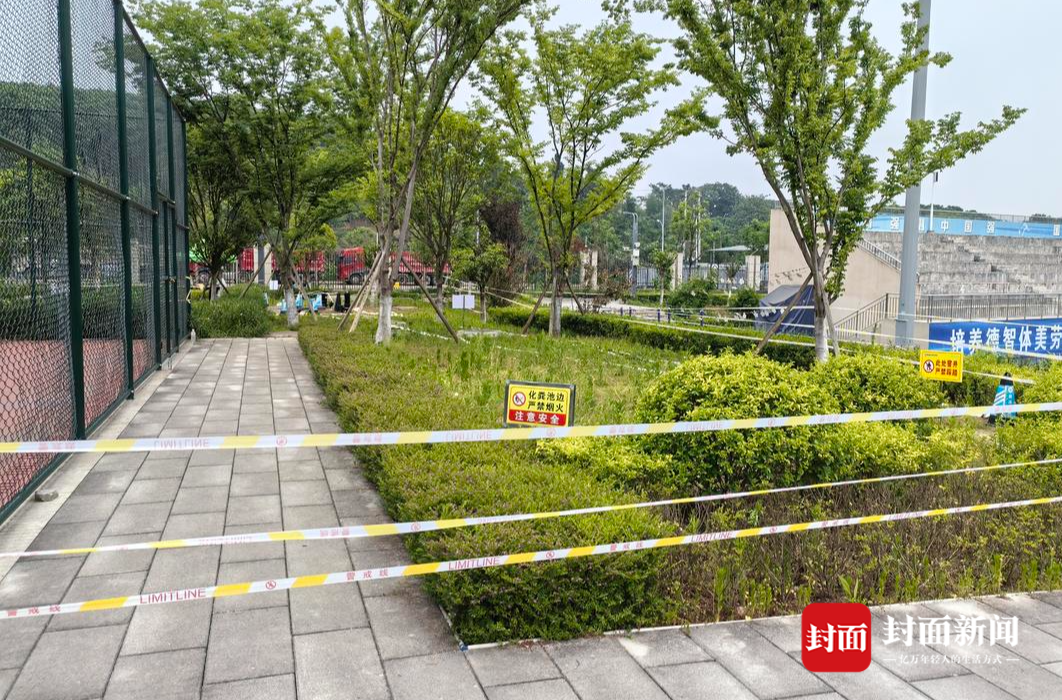 在草坪底下,就是一个化粪池,地面有4个窨井口。目前,整块草坪被警戒线围上,站有多位保安值守,不让人靠近。同时,草坪地面安置了多块写有“此处窨井,严禁踩踏”“化粪池边,严禁烟火”等字样的黄色警示牌。出事的窨井四周又被多个锥形桶围了一圈。