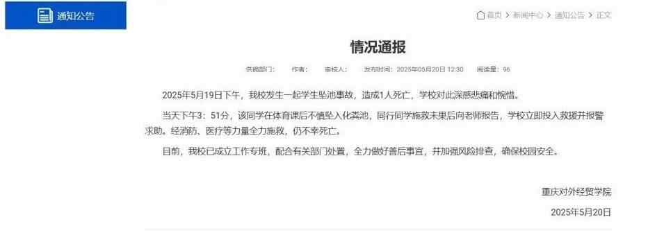 5月19日,重庆对外经贸学院一名男大学生坠入化粪池身亡,引发关注。