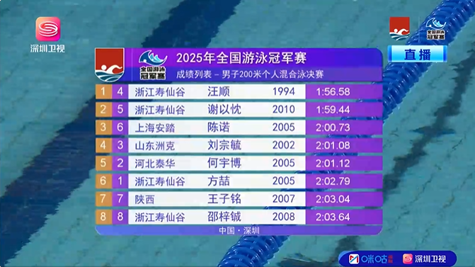 在5月21日晚举行的2025全国游泳冠军赛男子200米个人混合泳决赛中,汪顺以1分56秒58的成绩获得金牌!