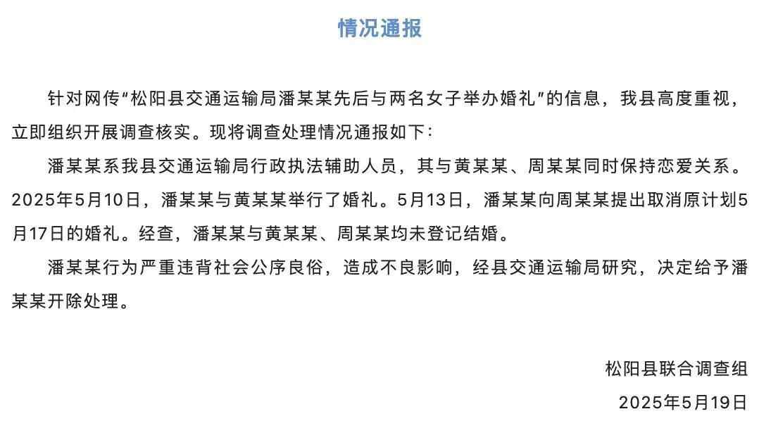 5月19日晚,浙江松阳县联合调查组发布情况通报称,潘某某系松阳县交通运输局行政执法辅助人员,其与黄某某、周某某同时保持恋爱关系。