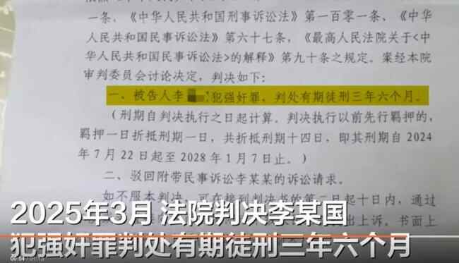 一审判决书显示,受害者曾受邀去李某国家吃饭和玩耍,李某国在此期间两次强奸了她。2025年3月,法院判处李某国犯有强奸罪,判处有期徒刑三年六个月。