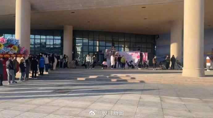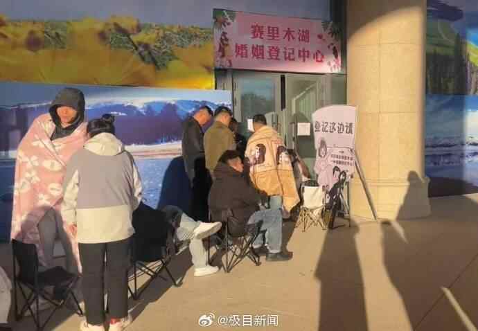 韩女士向记者拍摄的现场视频显示,在登记处有几十对新人正在排队,绵延数十米,由于天气寒冷,很多人不得不披着被子保暖,只为能早点登记。