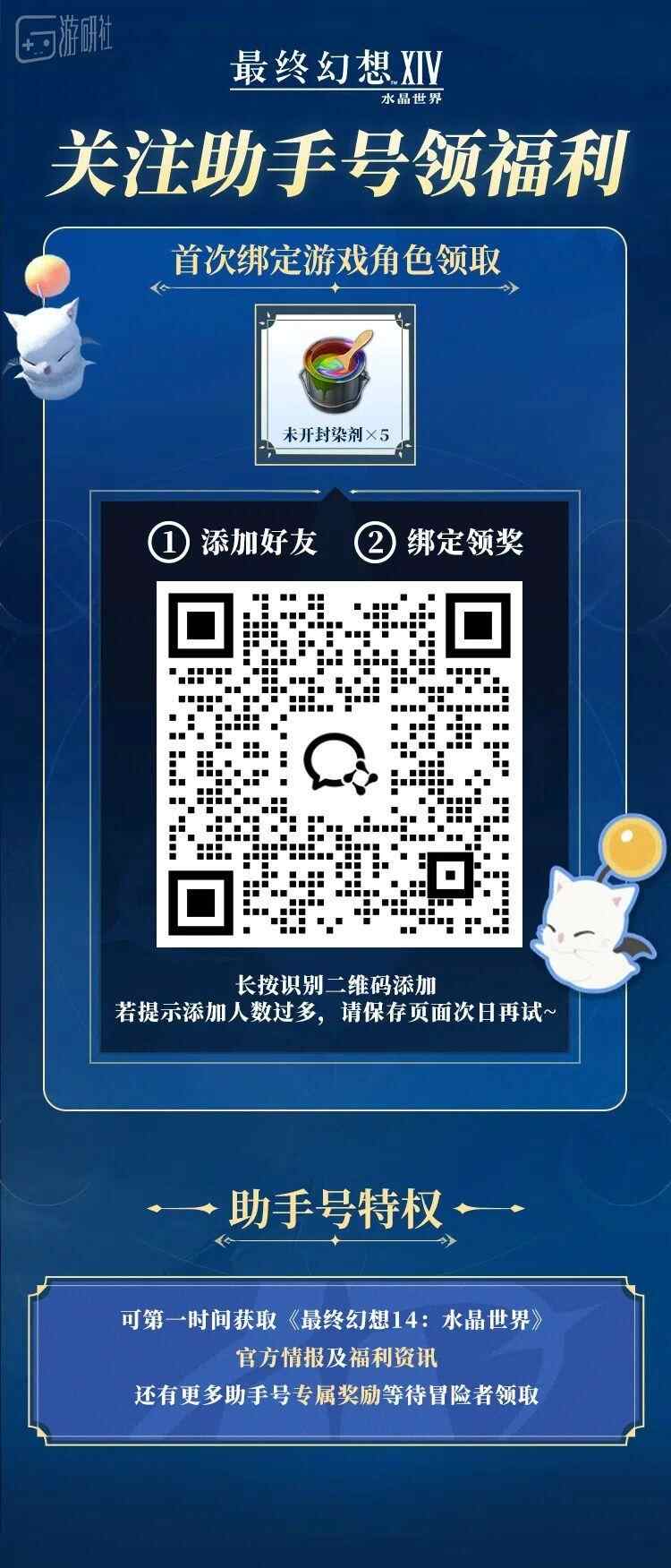 参与导师团活动的冒险者,可以在后续推出的<FF14手游官方社区>小程序中获得头衔认证,小程序是集WIKI攻略、资讯论坛、游戏工具于一体的一站式官方社区,还有【专属演技教材】可以获取。冒险者们可先扫码添加<官方企微小助手>,快人一步获取一手资讯,还能提前领取莫古力专属好礼——未开封染剂x5!