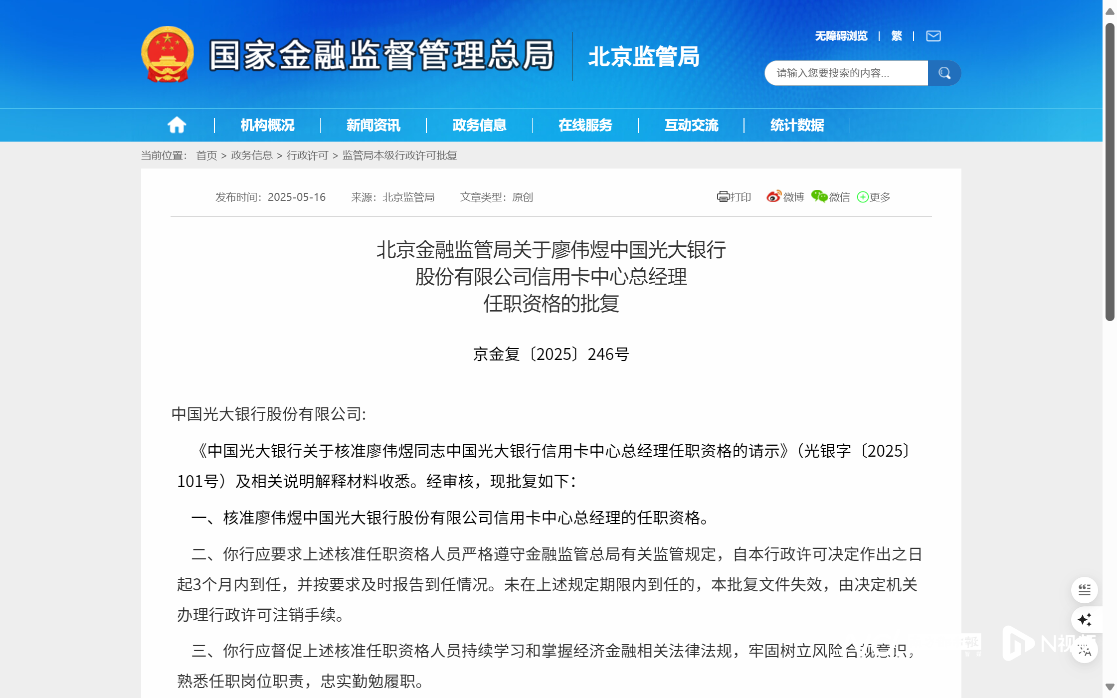 5月16日,国家金融监督管理总局北京监管局发布批复,核准了廖伟煜光大银行信用卡中心总经理的任职资格。