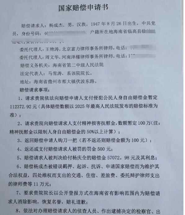 5月20日,记者从杨成杰的代理律师、北京富力律师事务所律师王艳涛处了解到,杨成杰向海南市第二中级人民法院提出国家赔偿申请,申请赔偿金额约128万元。