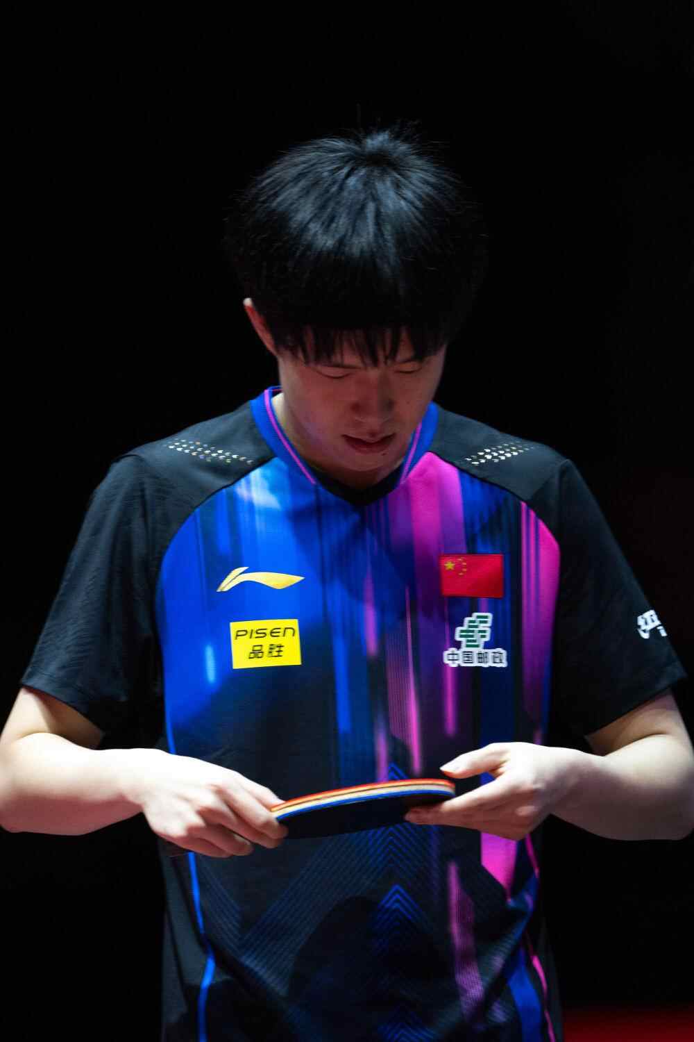 5月19日,王楚钦在比赛前检查球拍。新华社记者 肖艺九 摄