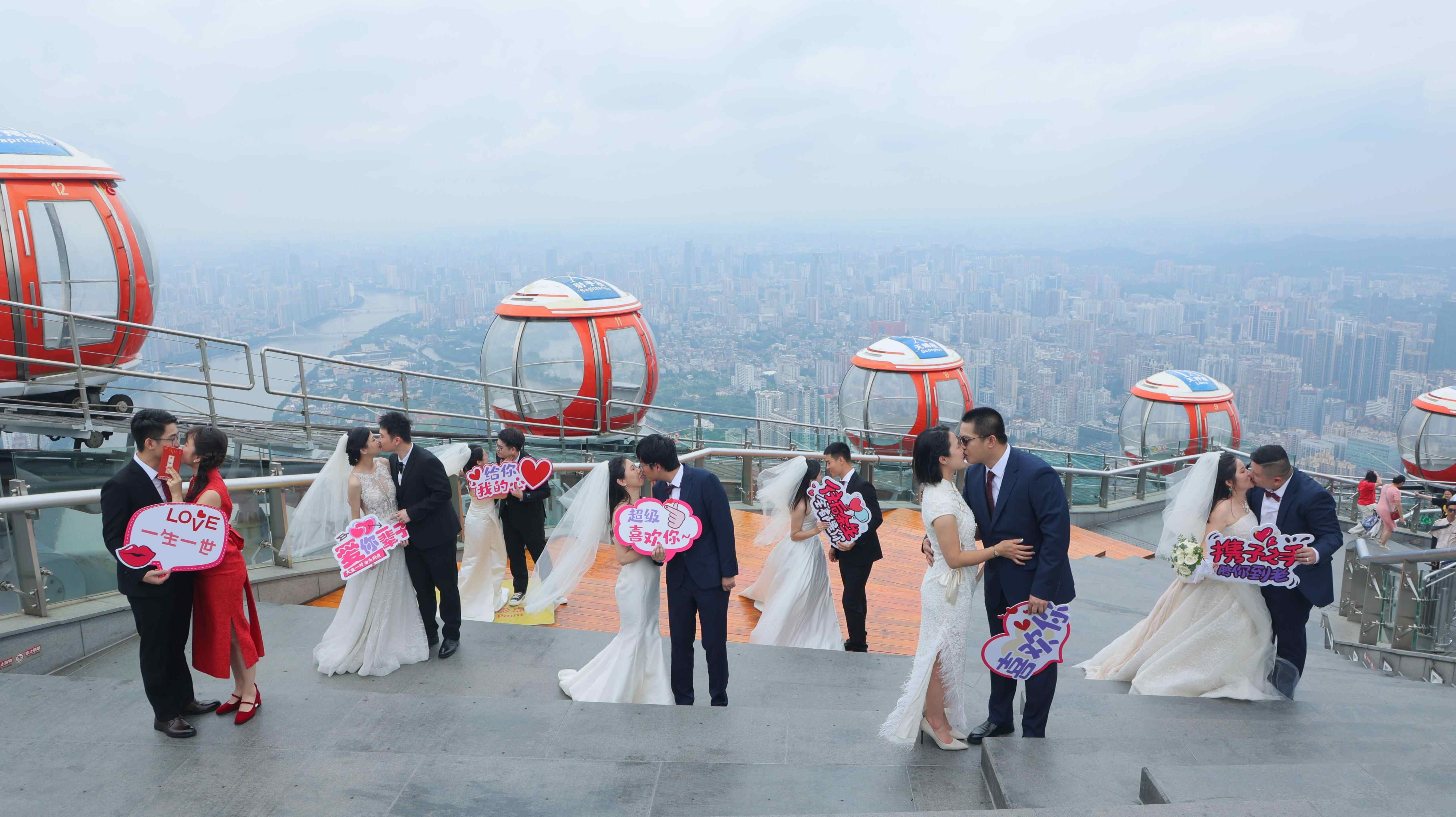 在城市标志景观中留下浪漫一刻的印记。5月20日,广州市海珠区“花城有囍”集体颁证活动在云端浪漫启幕。当天登记的广州新人们在这场以“海誓山盟 珠联璧合”为主题的“水陆空”盛典立下爱的誓言。