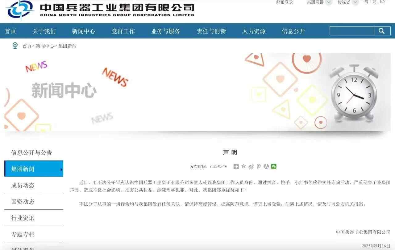 5月16日,中国兵器工业集团发布声明称,近日,有不法分子冒充认识中国兵器工业集团有限公司负责人或以该集团工作人员身份,通过抖音、快手、小红书等软件实施诈骗活动,严重侵害了该集团声誉,造成不良社会影响,损害公共利益,涉嫌刑事犯罪。