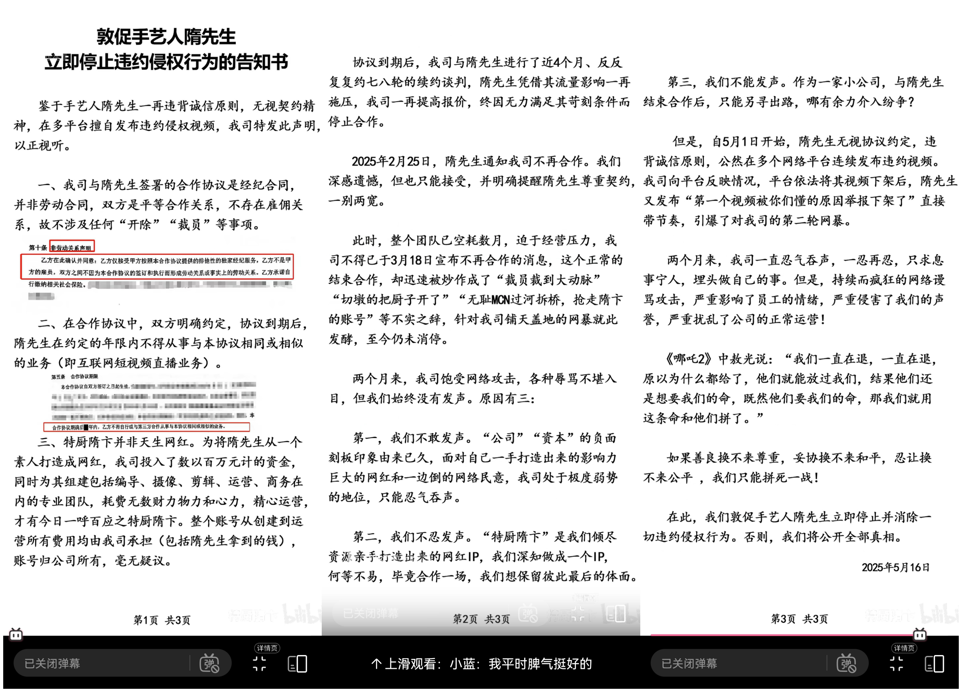 5月16日,原账号“@特厨隋卞”发布视频《敦促手艺人隋先生立即停止违约侵权行为》,称“隋先生一再违背诚信原则,无视契约精神,在多平台擅自发布违约侵权视频”。视频提到,公司与隋先生签署的合作协议是经纪合同,“在合作协议中,双方明确约定,协议到期后隋先生在约定的年限内不得从事与本协议相同或相似的业务(即互联网短视频直播业务)”。