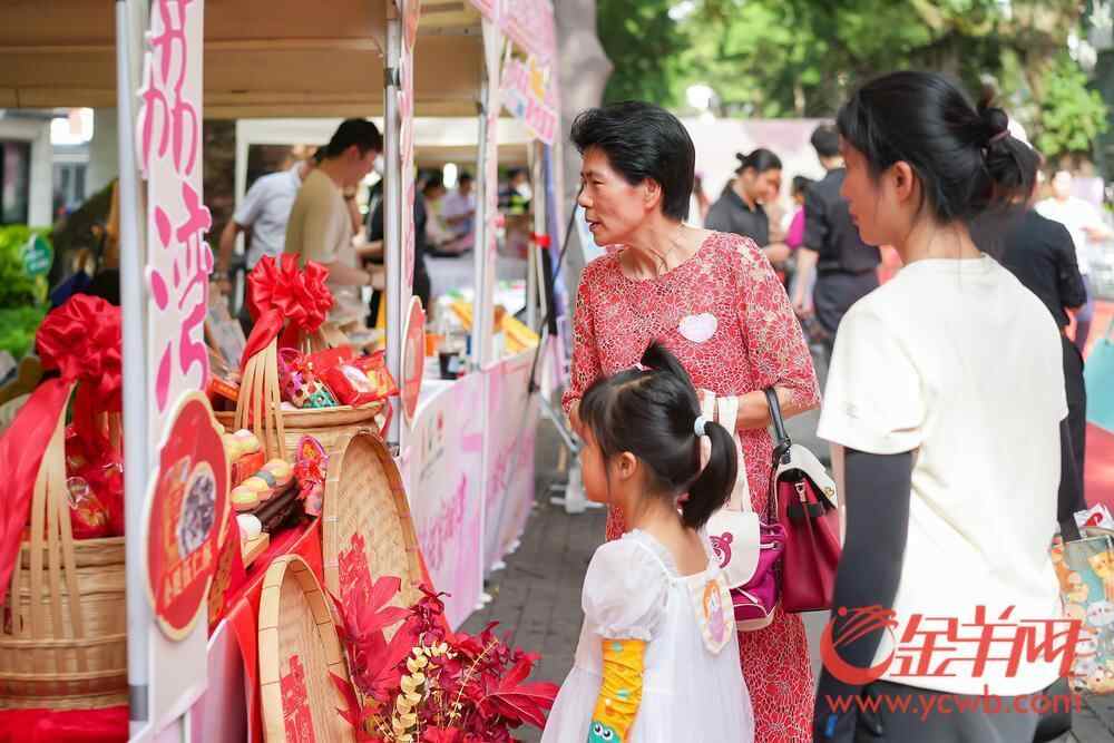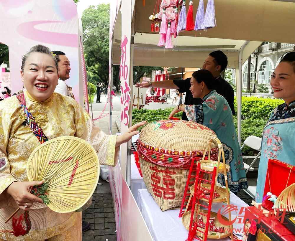 广府传统婚礼少不了婚庆物品,在“荔湾囍市”甜蜜经济市集,摆放有金猪牌、龙凤手镯、柚子水等多款婚庆用品。“今年,我们特意为新人准备了镀24k金的金猪牌,寓意新人多子多福;还准备了龙凤金手镯供新人抽奖。”卢燕武介绍,随着时代发展,婚俗物品也有了创新,比如开发了柚子喷雾水,可以代替洒柚子水,新人行礼前喷一下,寓意忘记过去不好的事物,精神地走进新生活。