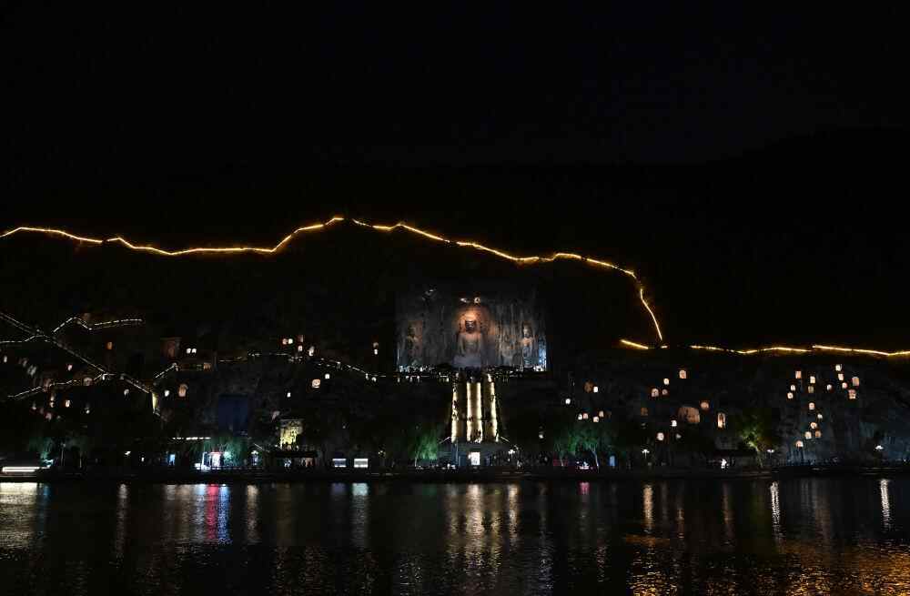 2025年4月24日,游客在龙门石窟夜游。