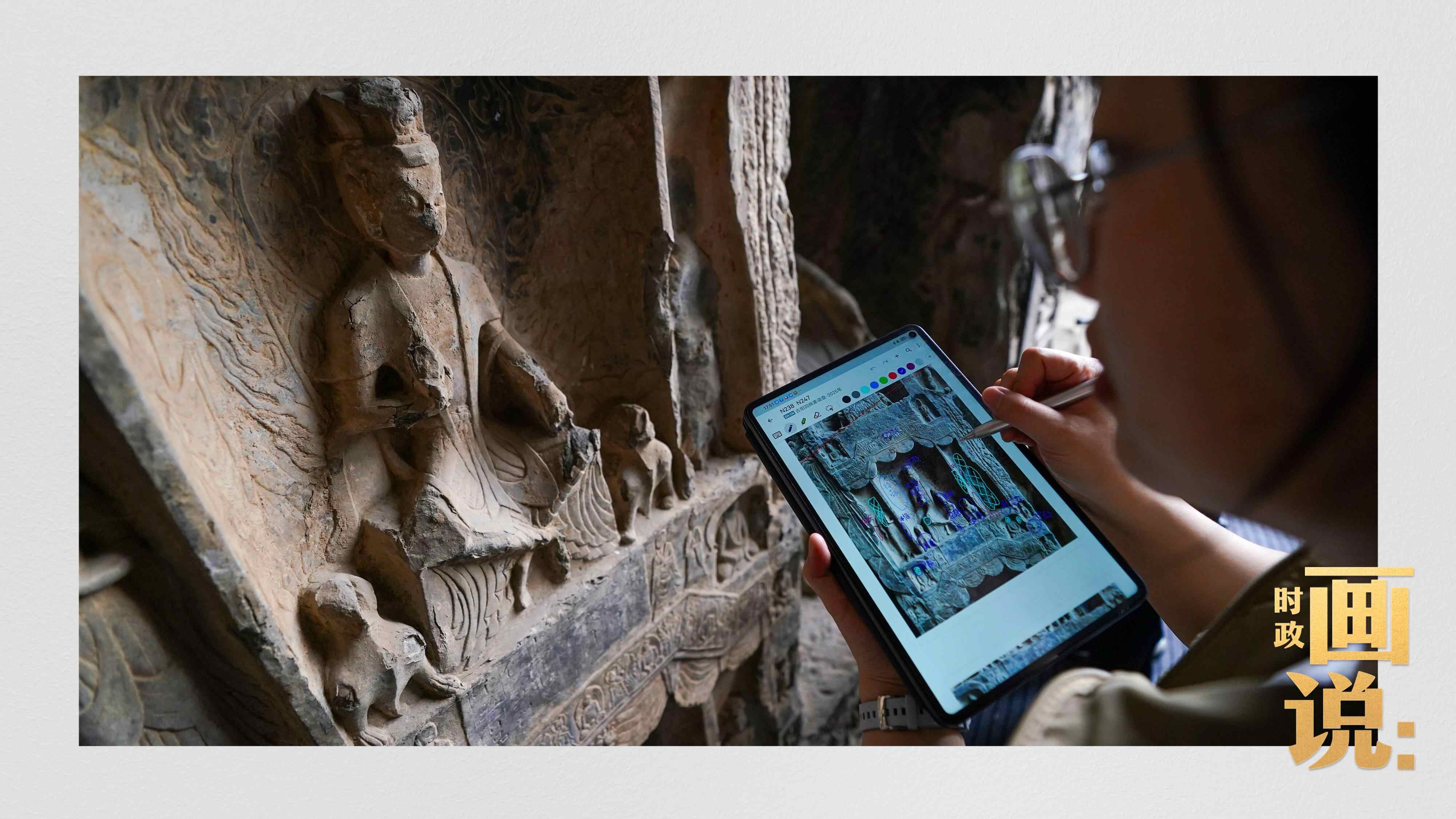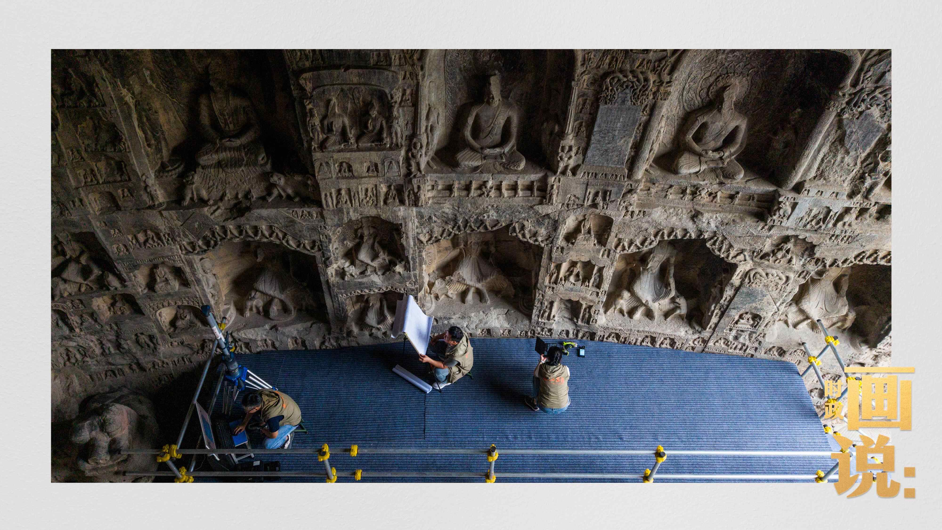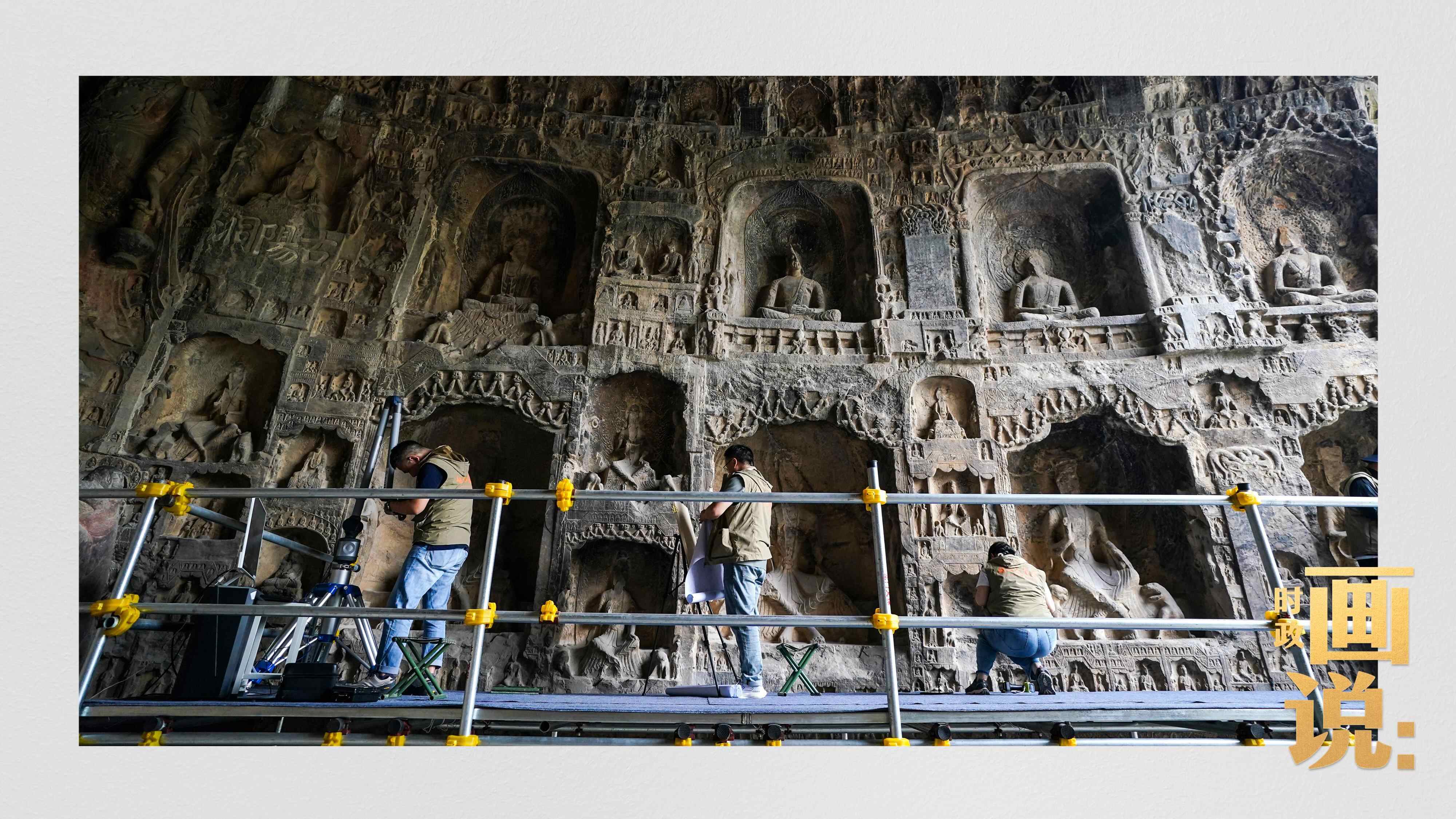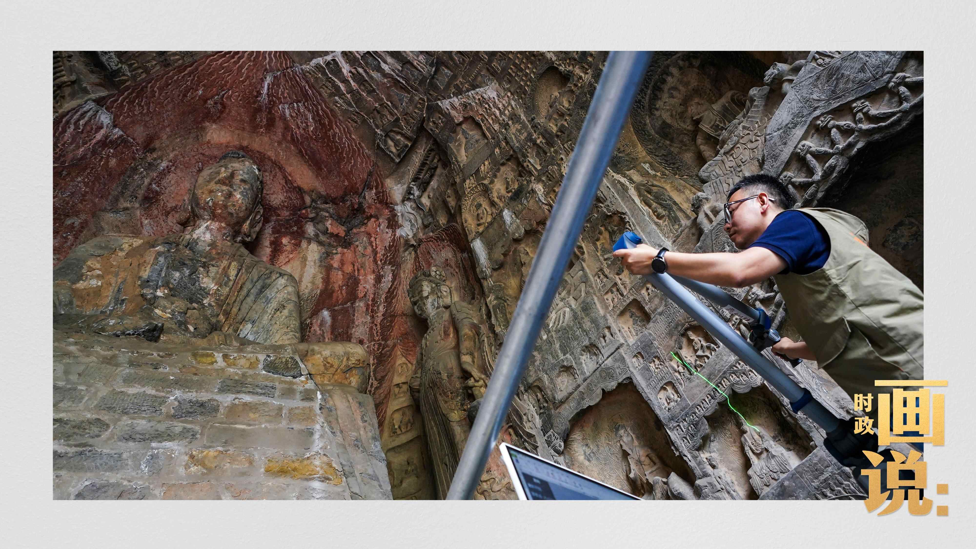 △龙门石窟研究院工作人员在古阳洞使用关节臂扫描仪对佛像进行数字化扫描