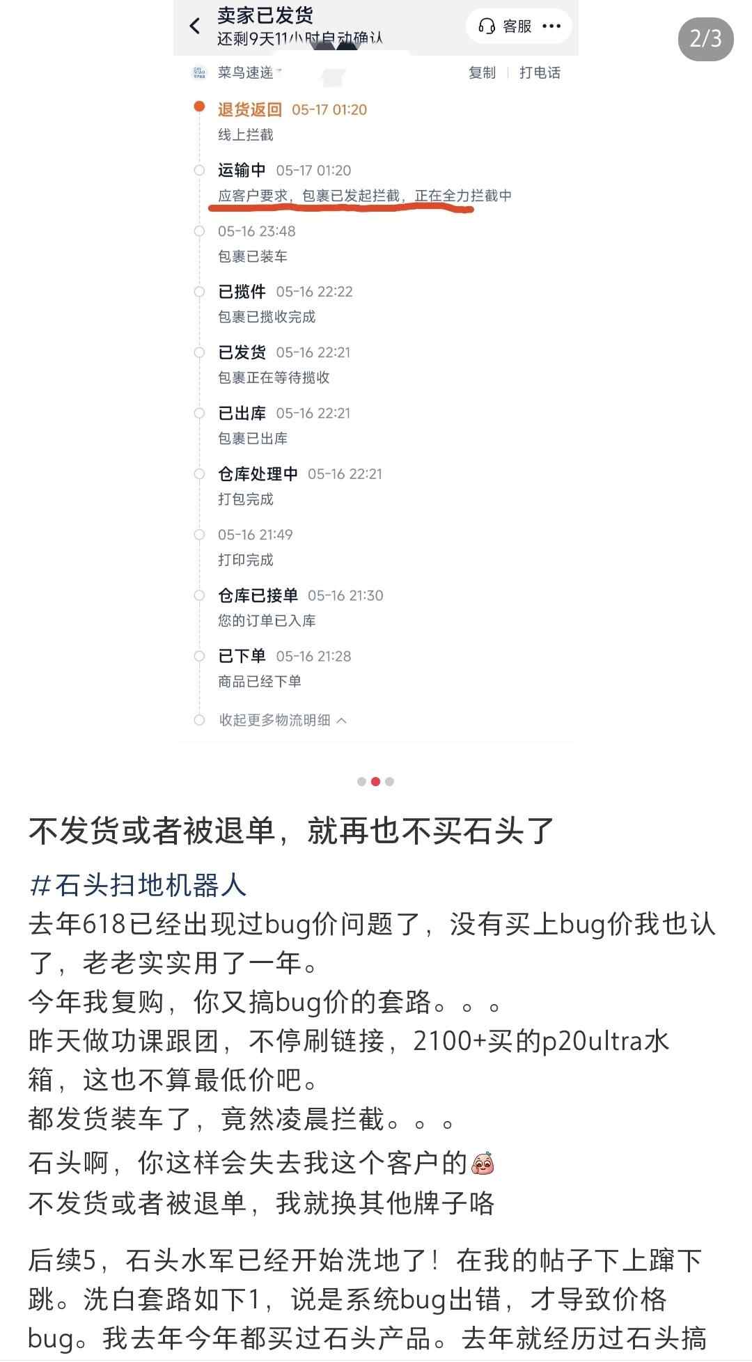 近日,多名网友在社交平台上爆料称,“618”活动期间低价购买石头扫地机器人后,在商家未提前沟通的情况下,被以“系统问题”为由强制退款,甚至是取消订单。