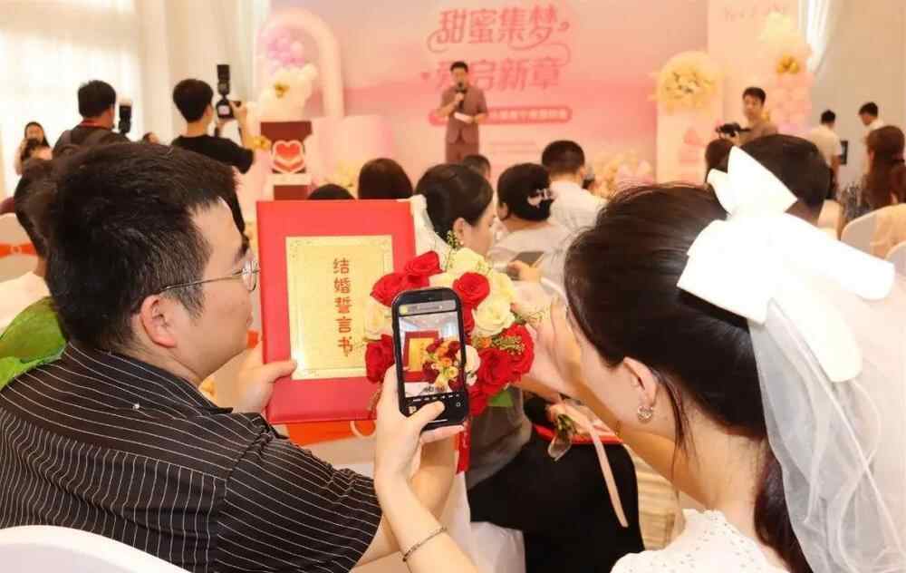 在现场,著名音乐唱作人王亮为现场送上甜蜜歌曲,动人的歌声和旋律开启新人幸福时刻。与会嘉宾为新人颁发结婚证与“花城有囍”纪念婚书,送上美好祝福,倡导简约适度、文明向上的婚俗礼仪新风尚,增强结婚登记仪式感、责任感。