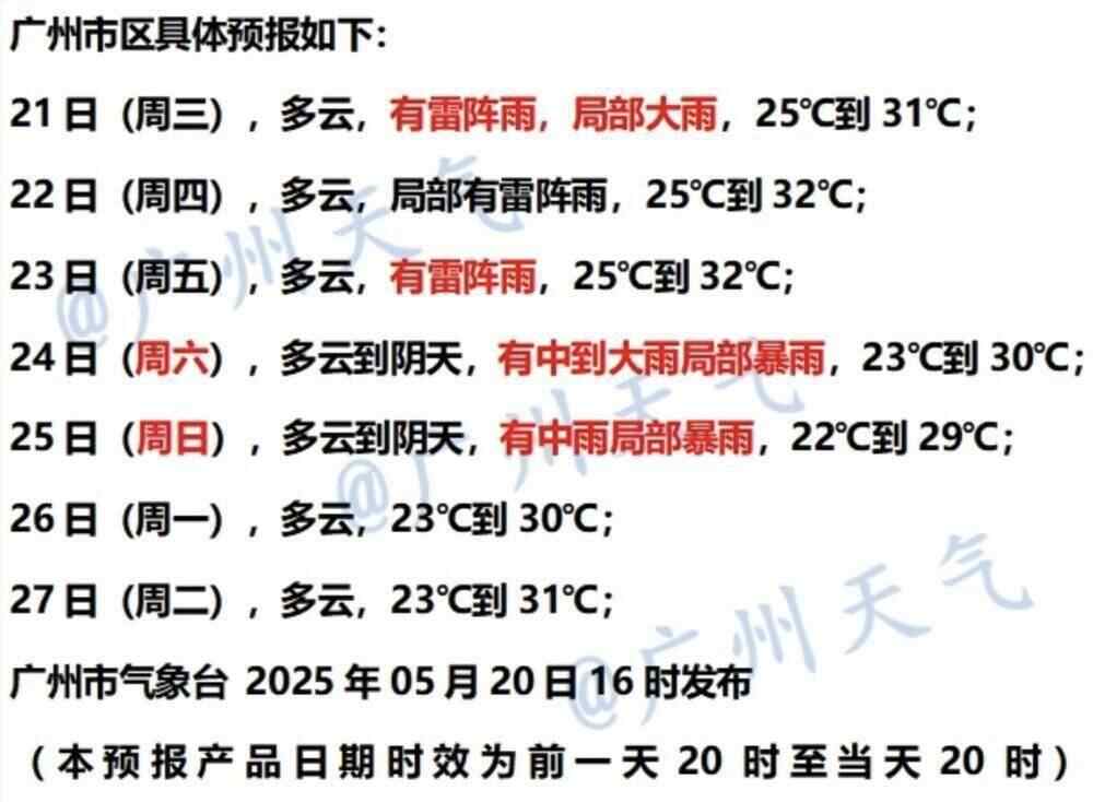 广州市气象台5月20日预计,21日至23日白天,广州天气相对稳定,其间虽有雷阵雨局部大雨,但总体仍以多云到阴天为主。预计23日夜间起至25日,受高空槽、切变线和弱冷空气影响,广州又有一次强降水伴强对流天气过程。