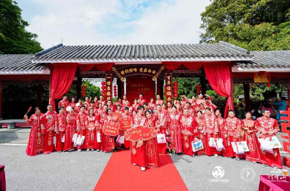 其中,帽峰山分会场以“帽峰山盟·岭南囍誓”集体婚礼为主题,为新人打造了一场充满岭南特色的浪漫婚礼。在青山绿水间,新人身着精美的婚纱礼服,许下一生的承诺,传统与现代的完美融合,让这场婚礼仪式别具一格。