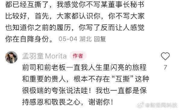 今年5月初,有网友在孟羽童的社交账号底下留言称:“都已经互撕了,我感觉你不写某董事长秘书比较好,首先,大家都认识你,你不写大家也知道你之前的履历,你写了反而让人感觉你在自降身份。”