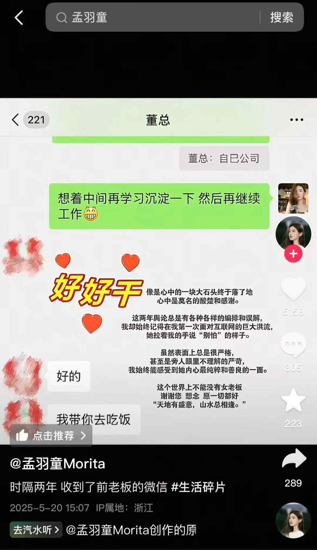 据悉,20日下午,孟羽童在社交媒体账号上分享了一张图片,并配文称:“时隔两年,收到了前老板的微信。”图片显示对话对方为“董总”,称“我带你去吃饭”。孟羽童表示,“这个世界上不能没有女老板。”