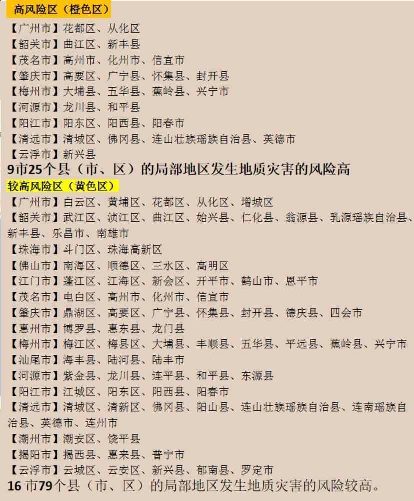 根据前期降雨、地质灾害发生规律、地质环境背景条件及预测降雨综合分析研判,广州市、韶关市、茂名市等9市25个县(市、区)的局部地区发生地质灾害的风险高,16市79个县(市、区)的局部地区发生地质灾害的风险较高,共涉及地质灾害隐患点2200余处,重点防御区51万余个。