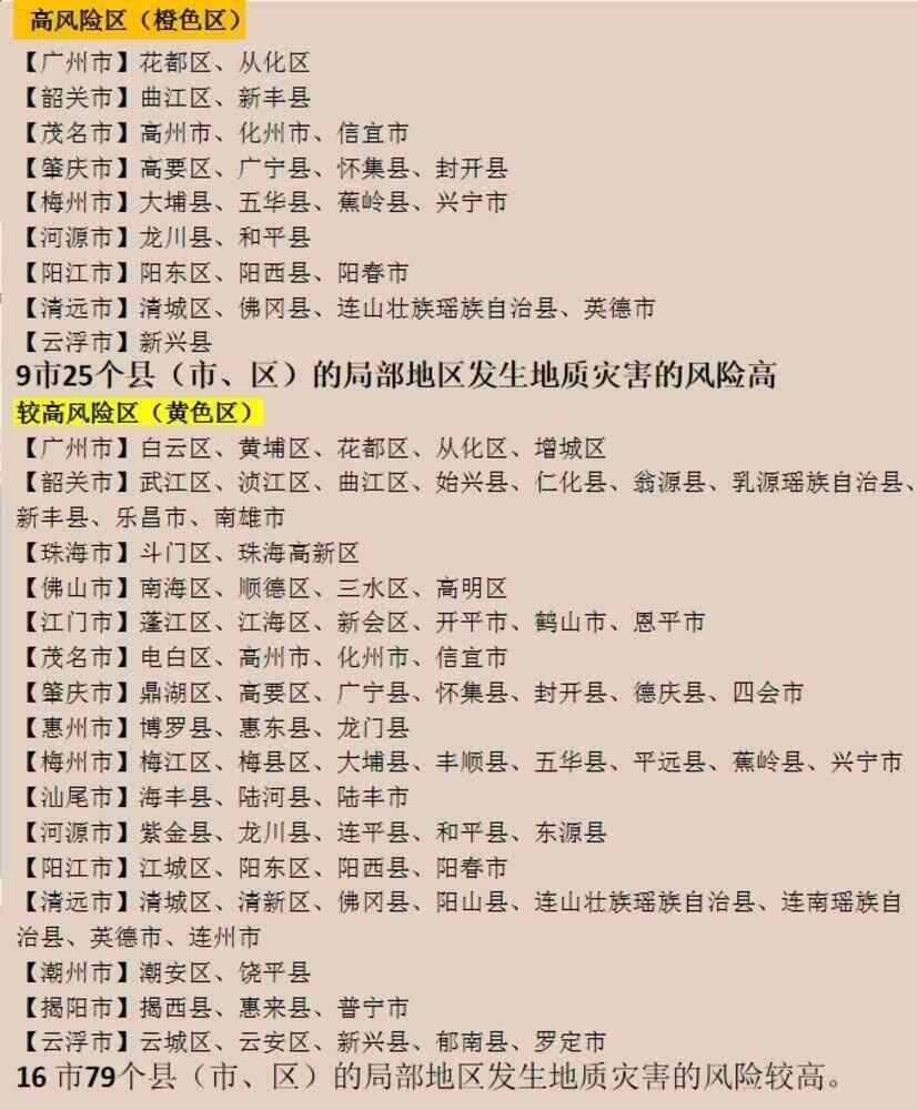 根据前期降雨、地质灾害发生规律、地质环境背景条件及预测降雨综合分析研判,广州市、韶关市、茂名市等9市25个县(市、区)的局部地区发生地质灾害的风险高,16市79个县(市、区)的局部地区发生地质灾害的风险较高,共涉及地质灾害隐患点2200余处,重点防御区51万余个。