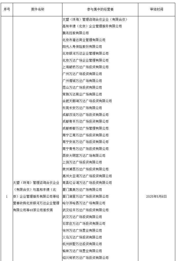 日前,国家市场监督管理总局发布的无条件批准经营者集中案件列表显示,5月6日,太盟(珠海)管理咨询合伙企业(有限合伙)、高和丰德(北京)企业管理服务有限公司等收购包括长沙开福万达广场投资有限公司等在内的48家公司股权案获批。
