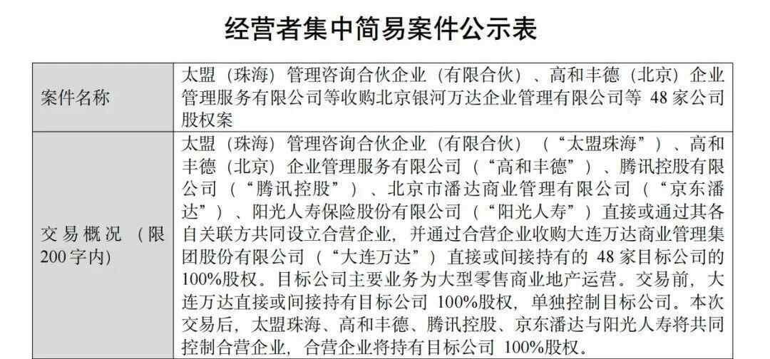 此次联合收购48家目标公司股权的企业包括:太盟(珠海)管理咨询合伙企业(有限合伙)(以下简称太盟珠海)、高和丰德(北京)企业管理服务有限公司(以下简称高和丰德)、腾讯控股有限公司(以下简称腾讯控股)、北京市潘达商业管理有限公司(以下简称京东潘达)、阳光人寿保险股份有限公司(以下简称阳光人寿)。前述五家公司直接或通过其各自关联方共同设立合营企业,并通过合营企业收购大连万达商业管理集团股份有限公司(以下简称大连万达)直接或间接持有的48家目标公司的100%股权。目标公司主要业务为大型零售商业地产运营。