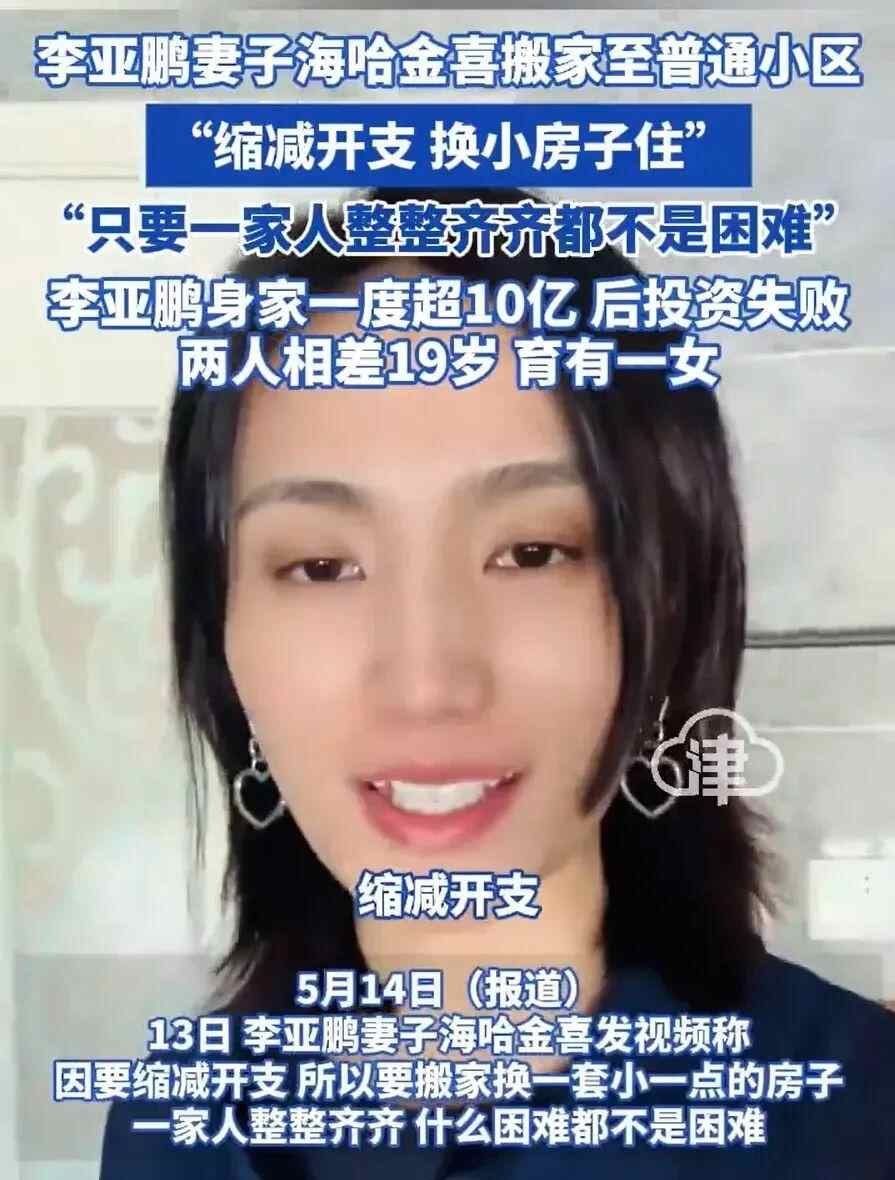 5月13日,李亚鹏妻子海哈金喜发视频称,因要缩减开支,所以要搬家换一套小一点的房子住。“在每一次搬家中,我们要学会适应、勇敢和独立。”