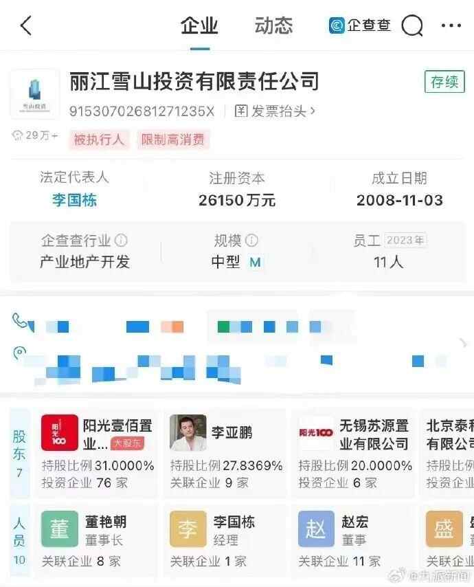 企查查显示,丽江雪山投资有限责任公司成立于2008年11月,法定代表人为李国栋,注册资本约2.6亿元人民币,由阳光壹佰置业集团有限公司、李亚鹏等共同持股,其中,李亚鹏持股约27.8%。