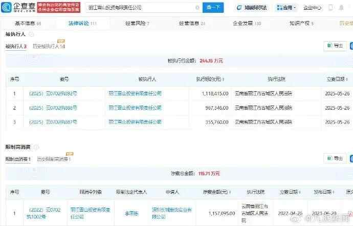 5月27日,企查查APP显示,近日,丽江雪山投资有限责任公司新增3条被执行人信息,被执行总金额约244万元,执行法院均为丽江市古城区人民法院。