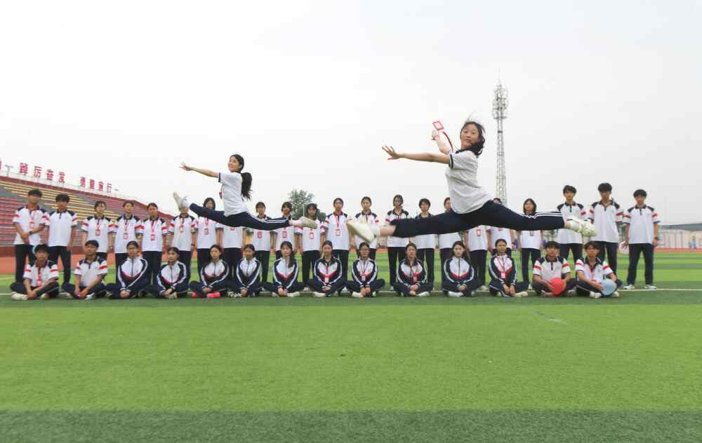 2025年5月22日,河北省石家庄新乐市第四中学高三学生进行“一字马”游戏表演。高考临近,各地学校组织高三学生开展不同形式的减压活动,帮助学生放松心情,迎接高考。新华社发(贾敏杰 摄)