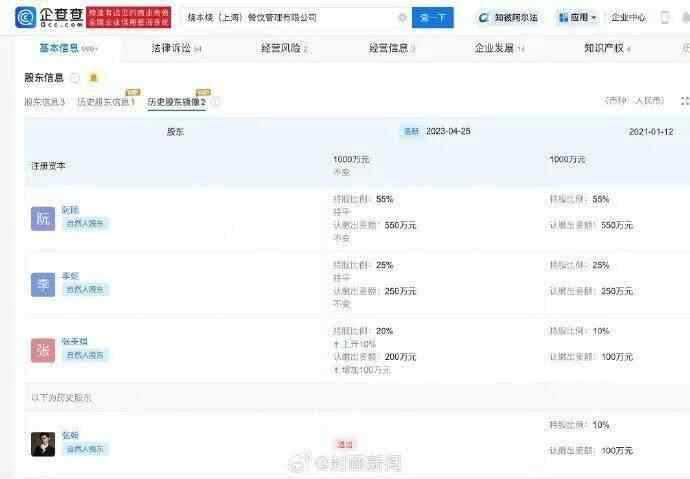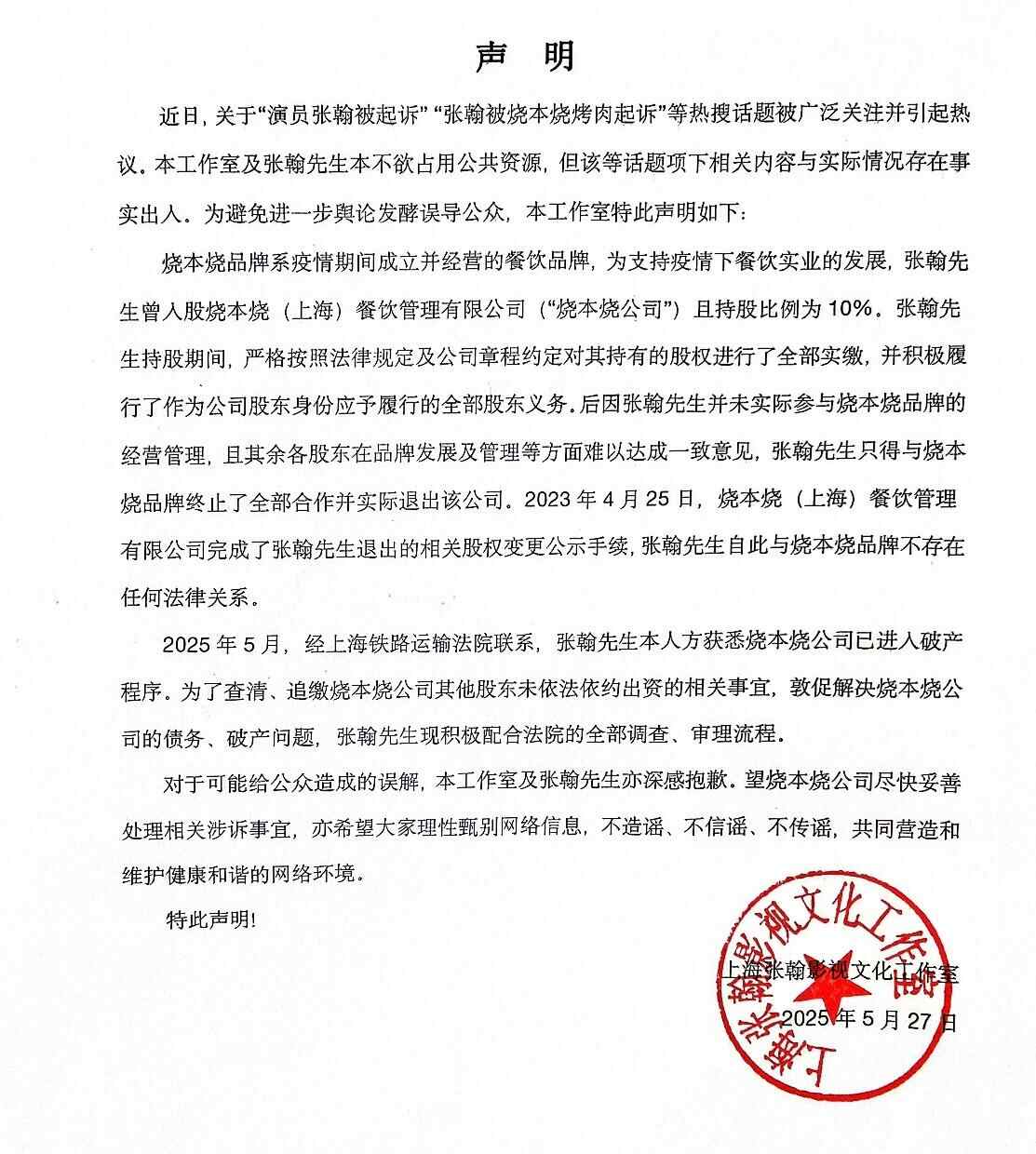 企查查APP显示,5月26日,法院送达烧本烧(上海)餐饮管理有限公司与张翰等追收未缴出资纠纷一案开庭传票等,将于7月28日在上海铁路运输法院开庭审理。信息显示,该公司成立于2021年1月,注册资本1000万元,张翰曾持股10%,并于2023年4月退出。