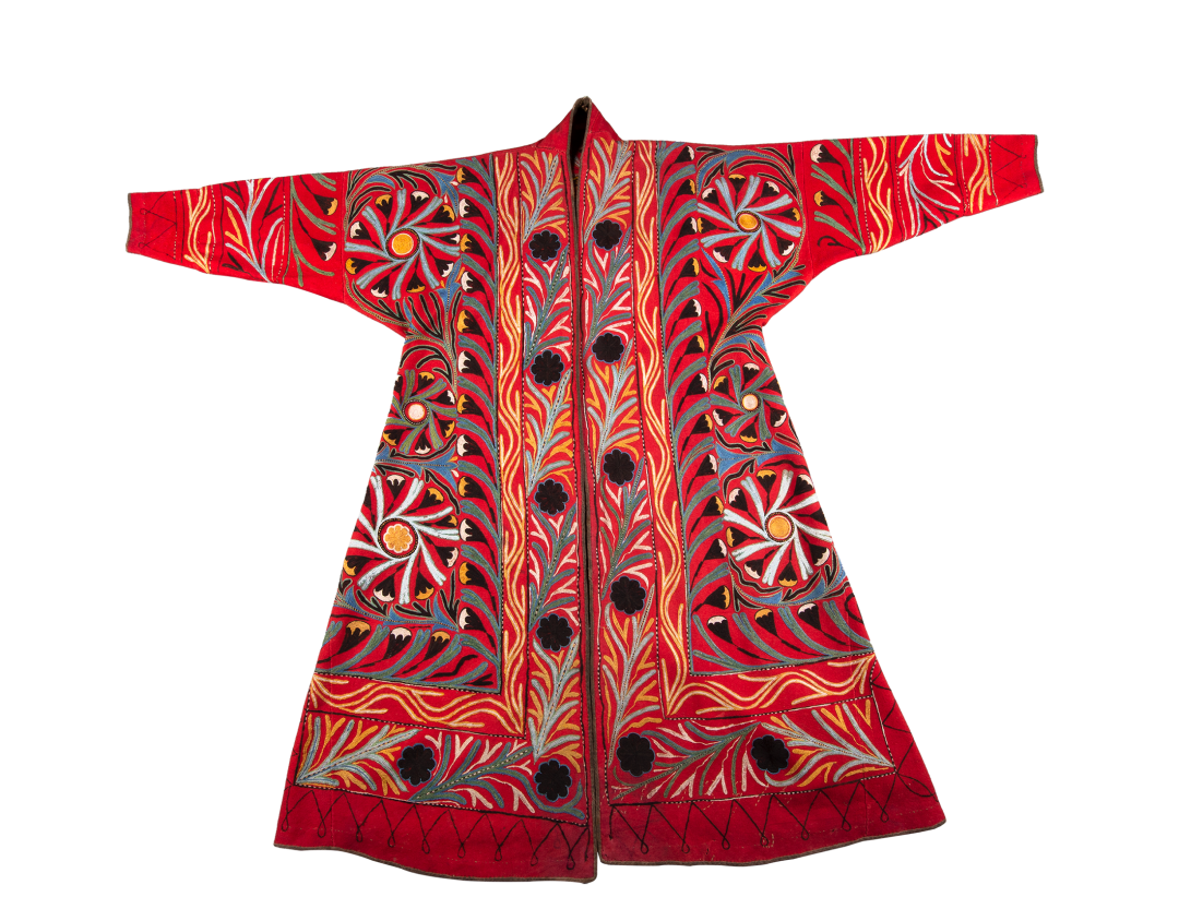 作为多元文化的交融荟萃之地,新疆自古便是艺术灵感的熔炉。当驼铃商队将丝绸、瓷器和茶饼运往西方时,刺绣工艺也随着丝路古道开枝散叶。袷袢的诞生,正是这场持续千年的文明对话的华丽注脚——汉晋时期的西域绣品已显露东西合璧的特质,至明清更加创新融合,既保留了游牧民族以羊毛鹿皮制衣的实用传统,又融汇了中原刺绣的灵动气韵。