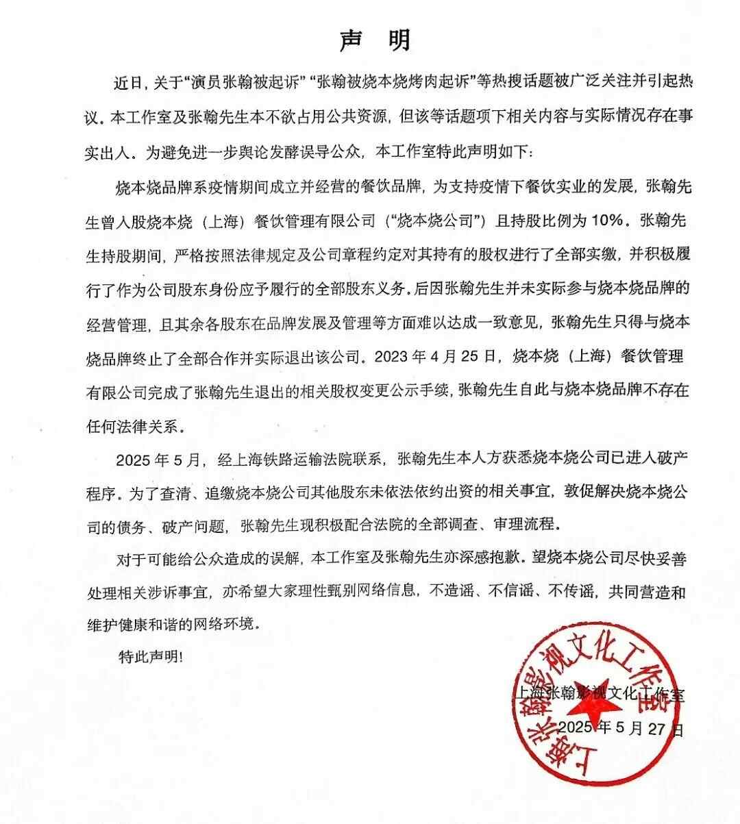 5月27日, 张翰工作室官方微博发布声明, 称张翰先生持股期间,严格按照法律规定及公司章程约定对其持有的股权进行了全部实缴,并积极履行了作为公司股东身份应予履行的全部股东义务。后因张翰先生并未实际参与烧本烧品牌的经营管理,且其余各股东在品牌发展及管理等方面难以达成一致意见,张翰先生只得与烧本烧品牌终止了全部合作并实际退出该公司。2023年4月25日,烧本烧(上海)餐饮管理有限公司完成了张翰先生退出的相关股权变更公示手续,张翰先生自此与烧本烧品牌不存在任何法律关系。