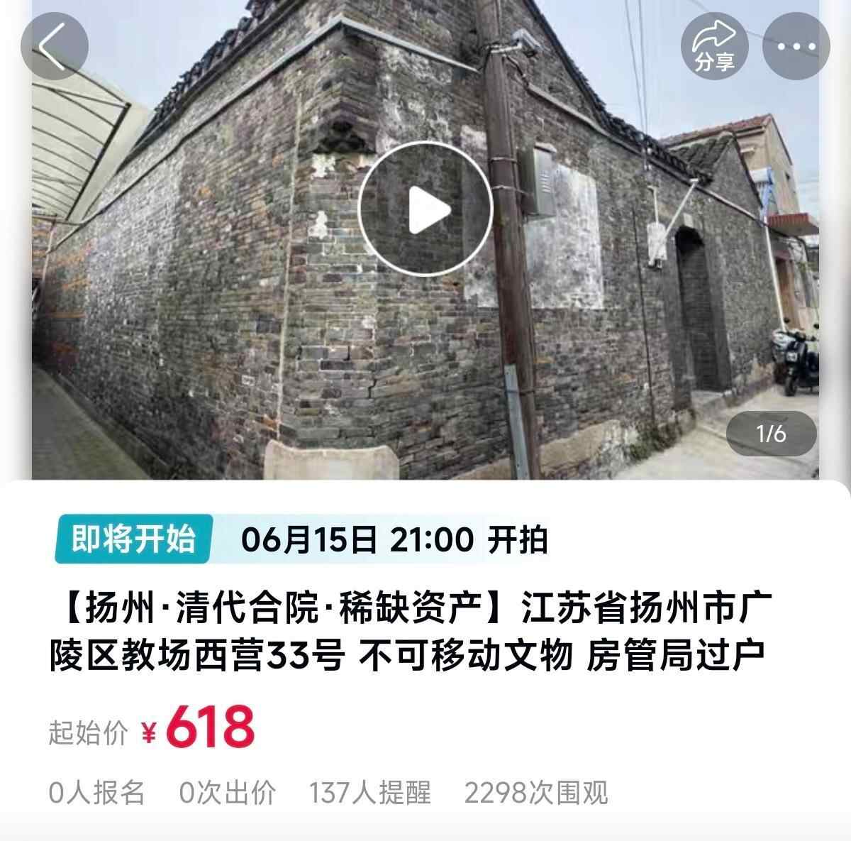 大皖新闻记者在网络拍卖平台注意到,此次拍卖的房屋位于江苏省扬州市广陵区教场西营33号,建筑面积为133.59平方米。平台信息显示,拍卖将于6月15日开始,起拍价618元,保证金为15万元,加价幅度2万元,截至发稿,还未有人报名参与。