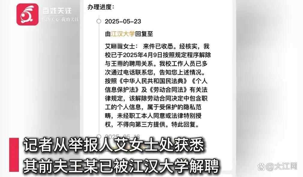 5月26日,记者从举报人艾女士处获悉,其前夫王某已被江汉大学解聘。