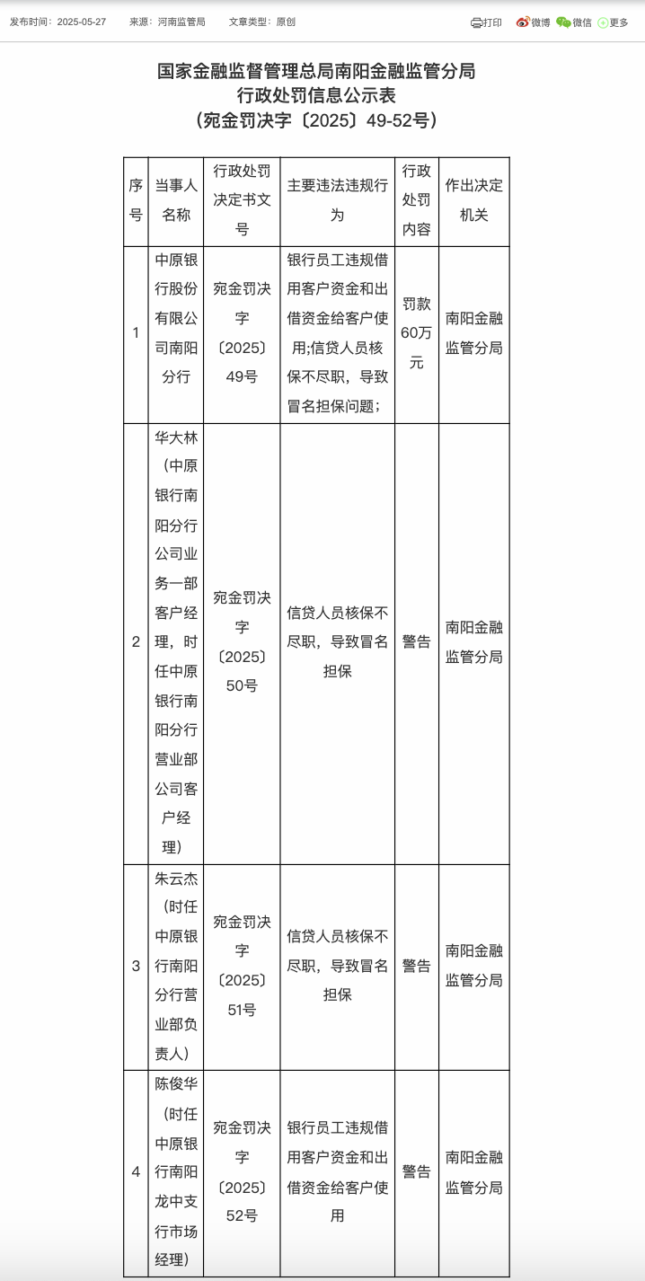 同时,时任中原银行南阳分行营业部公司客户经理华大林、时任中原银行南阳分行营业部负责人朱云杰、时任中原银行南阳龙中支行市场经理陈俊华被警告。其中,华大林、朱云杰涉及的主要违法违规行为是信贷人员核保不尽职,导致冒名担保,陈俊华涉及的主要违法违规行为是银行员工违规借用客户资金和出借资金给客户使用。