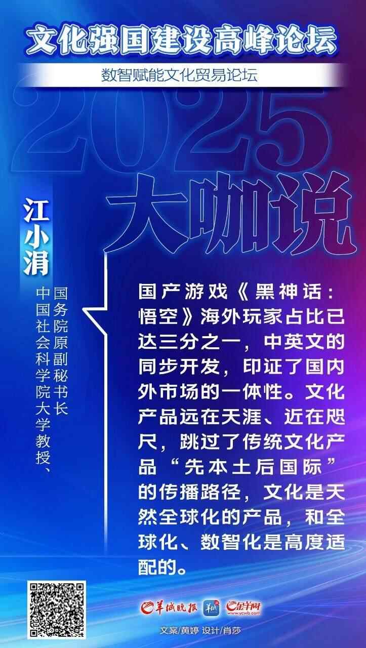 作为中国数智赋能文化创意的里程碑式产品,《黑神话:悟空》海外玩家占比达到三分之一。江小涓强调:“中英文的同步开发和发行,印证了国内外市场的一体性。文化产品远在天涯、近在咫尺,跳过了传统文化产品“先本土后国际”的传播路径。可以说,文化是天然全球化的产品,和全球化、数智化是高度适配的。”