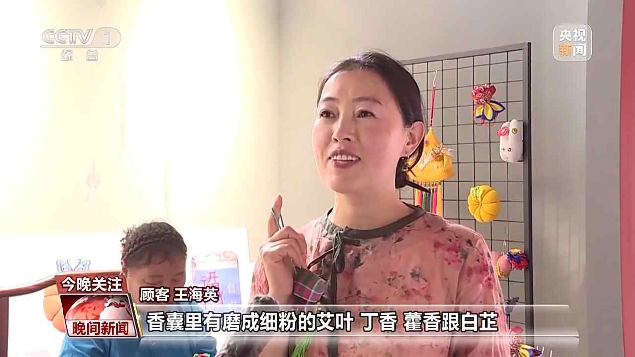 顾客 王海英:香囊里有磨成细粉的艾叶、丁香、藿香跟白芷。它有驱虫提神的功效,选一款比较适合自己戴的香囊佩戴。