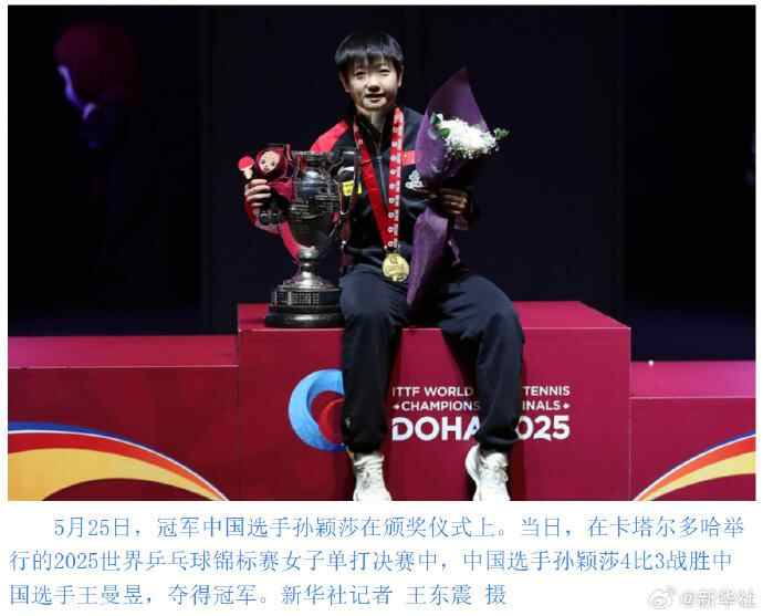 在国际乒联27日公布的最新一期世界排名中,多哈世乒赛女单冠军孙颖莎继续以较大优势领跑,并以11900分刷新现行世界排名体系下的积分纪录。中国队选手在女单、男单、女双和混双四个单项上占据世界第一。